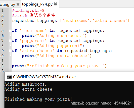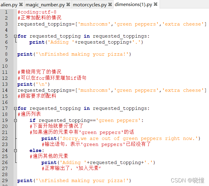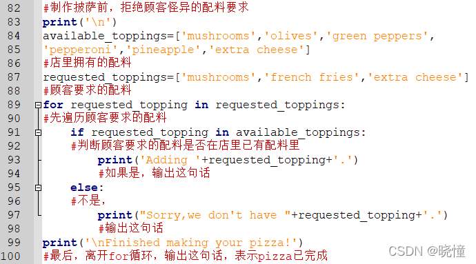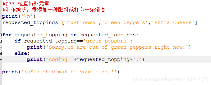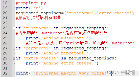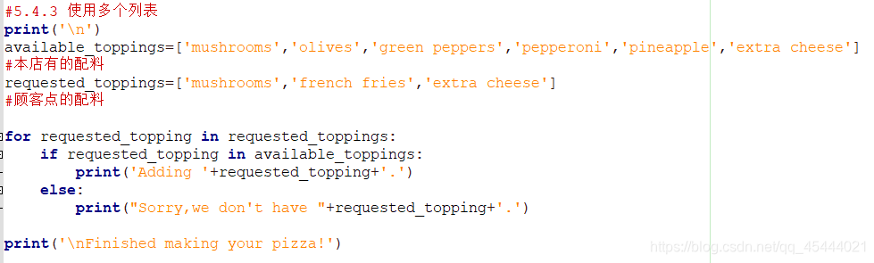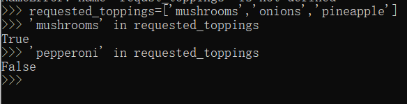 示例:在披萨里加调料。假如顾客点了几个配料放在列表里。就要挨个用if 测试配料是否在列表顾客点的配料里,而不能用除if之外的elif或者else。if-elif-else是三选一,只要有一个满足条件了,后面的条件就不看了,这是他们的区别所在。所以要用if...in...