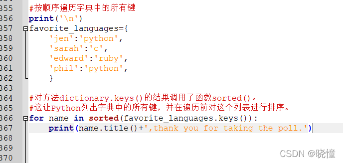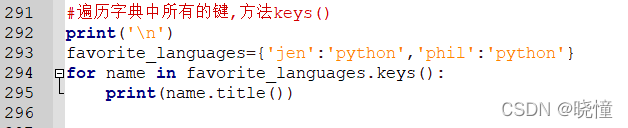 #遍历字典中所有的键,方法keys():for name in favorite_languages.keys():