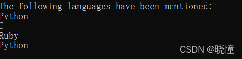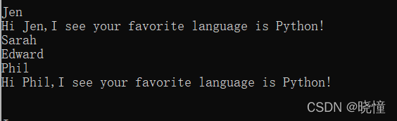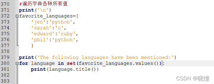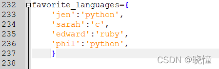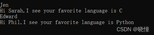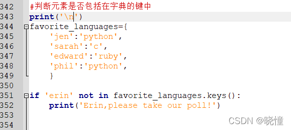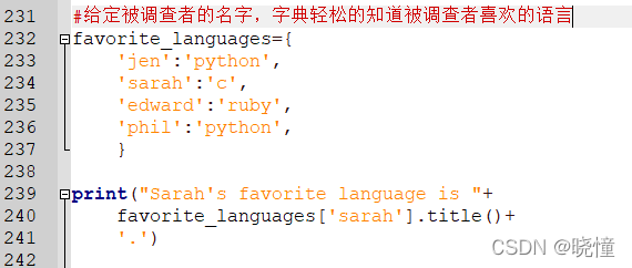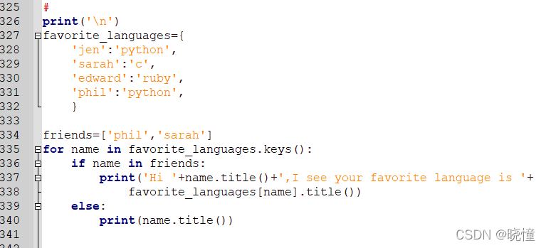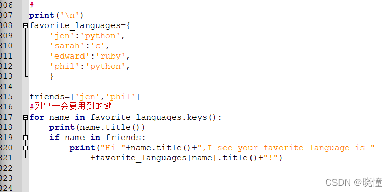 下面来打印两条消息,指出两位朋友喜欢的语言。我们像前面一样遍历字典中的名字(即,键),但在名字为指定朋友(创建friends列表,在字典中找2个键放在列表里)的名字时,打印一条消息,指出其喜欢的语言