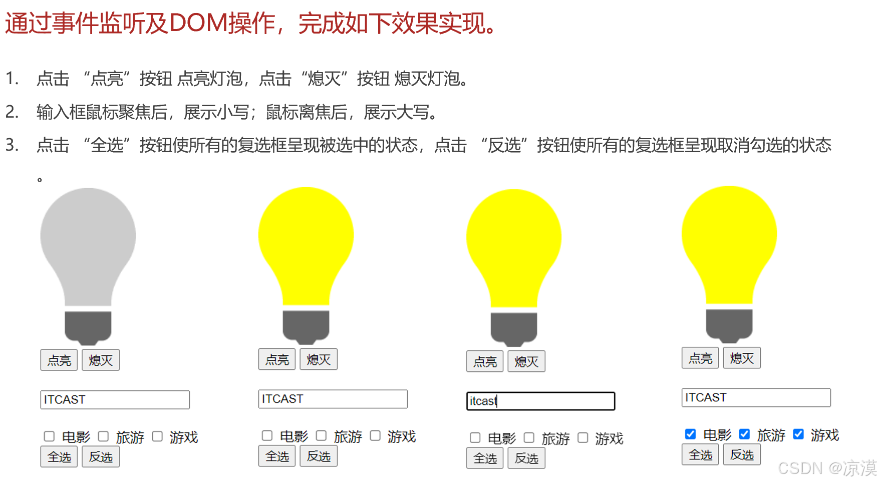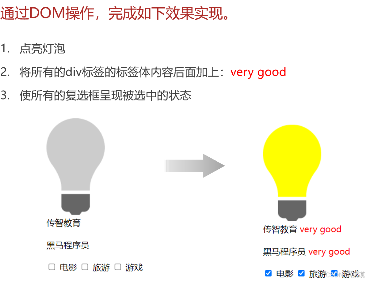 //1. 点击 "点亮" 按钮, 点亮灯泡; 点击 "熄灭" 按钮, 熄灭灯泡; -- onclick