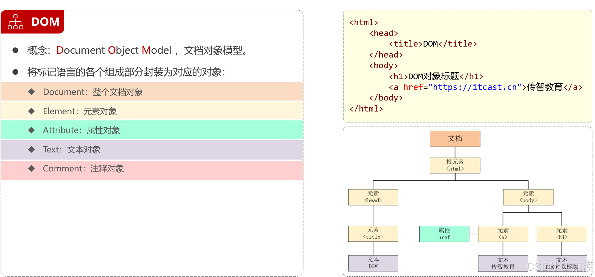 DOM是 W3C(万维网联盟)的标准,定义了访问HTML和XML文档的标准,分为3个不同的部分: