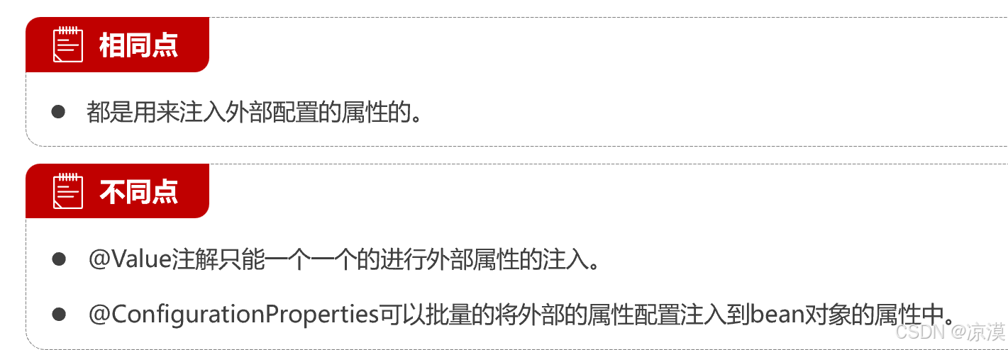 如果要注入的属性非常的多,并且还想做到复用,就可以定义这么一个 bean 对象。通过 configuration properties 批量的将外部的属性配置直接注入到 bin 对象的属性当中。在其他的类当中,我要想获取到注入进来的属性,我直接注入 bin 对象,然后调用 get 方法,就可以获取到对应的属性值了