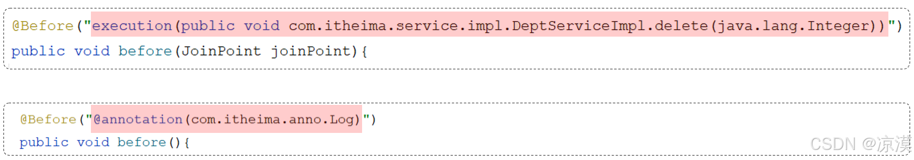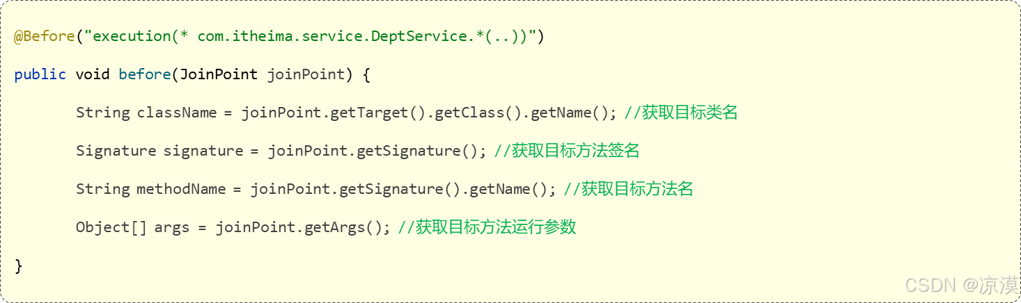 - @Around 环绕通知需要自己调用 ProceedingJoinPoint.proceed() 来让原始方法执行,其他通知不需要考虑目标方法执行