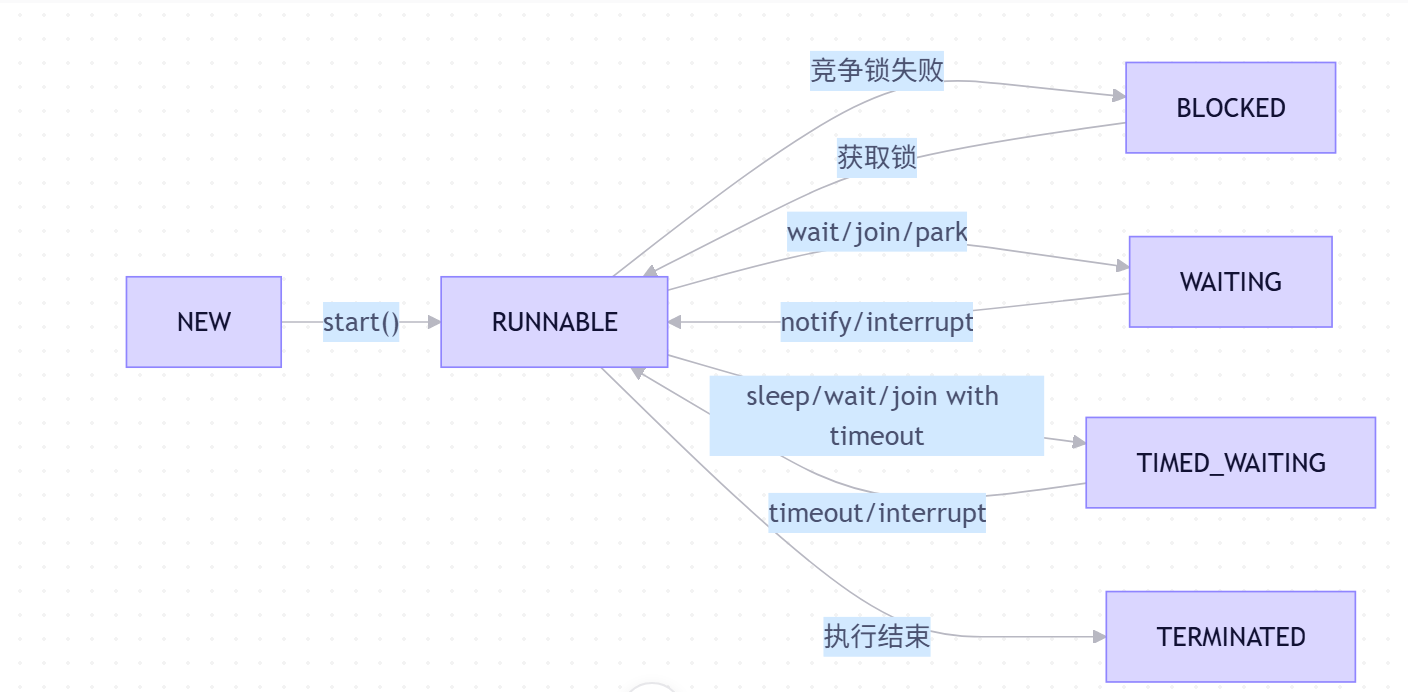 RUNNABLE状态包括了操作系统层面的“就绪”和“运行”两种状态。- 并不意味着线程正在运行,只是说它可以运行,等待CPU调度。