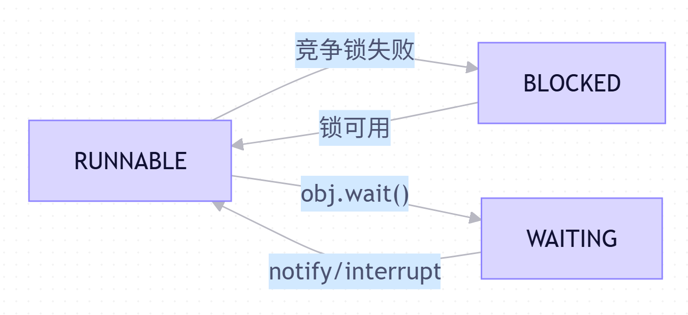 WAITING状态时,它不会像sleep()那样自动恢复,而是需要外部显式唤醒才能重新进入RUNNABLE状态。
