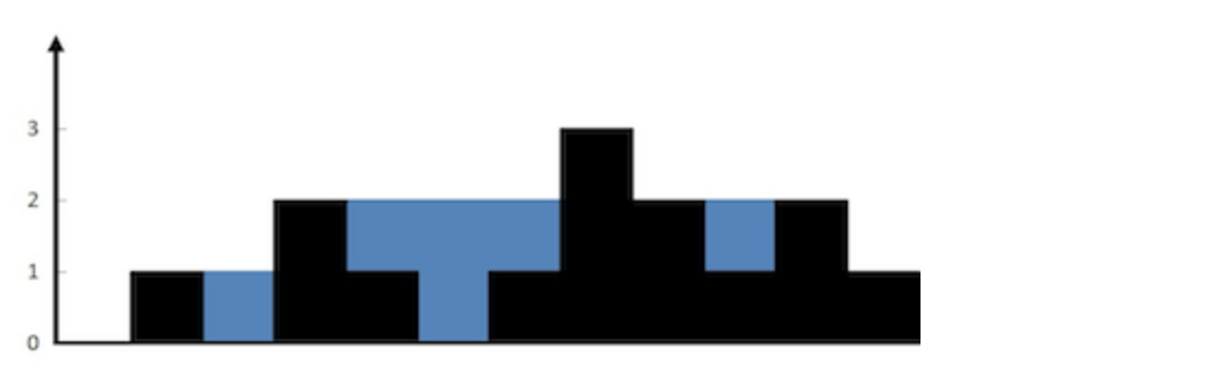 输入:height = [0,1,0,2,1,0,1,3,2,1,2,1] 输出:6 解释:上面是由数组 [0,1,0,2,1,0,1,3,2,1,2,1] 表示的高度图,在这种情况下,可以接 6 个单位的雨水(蓝色部分表示雨水)。