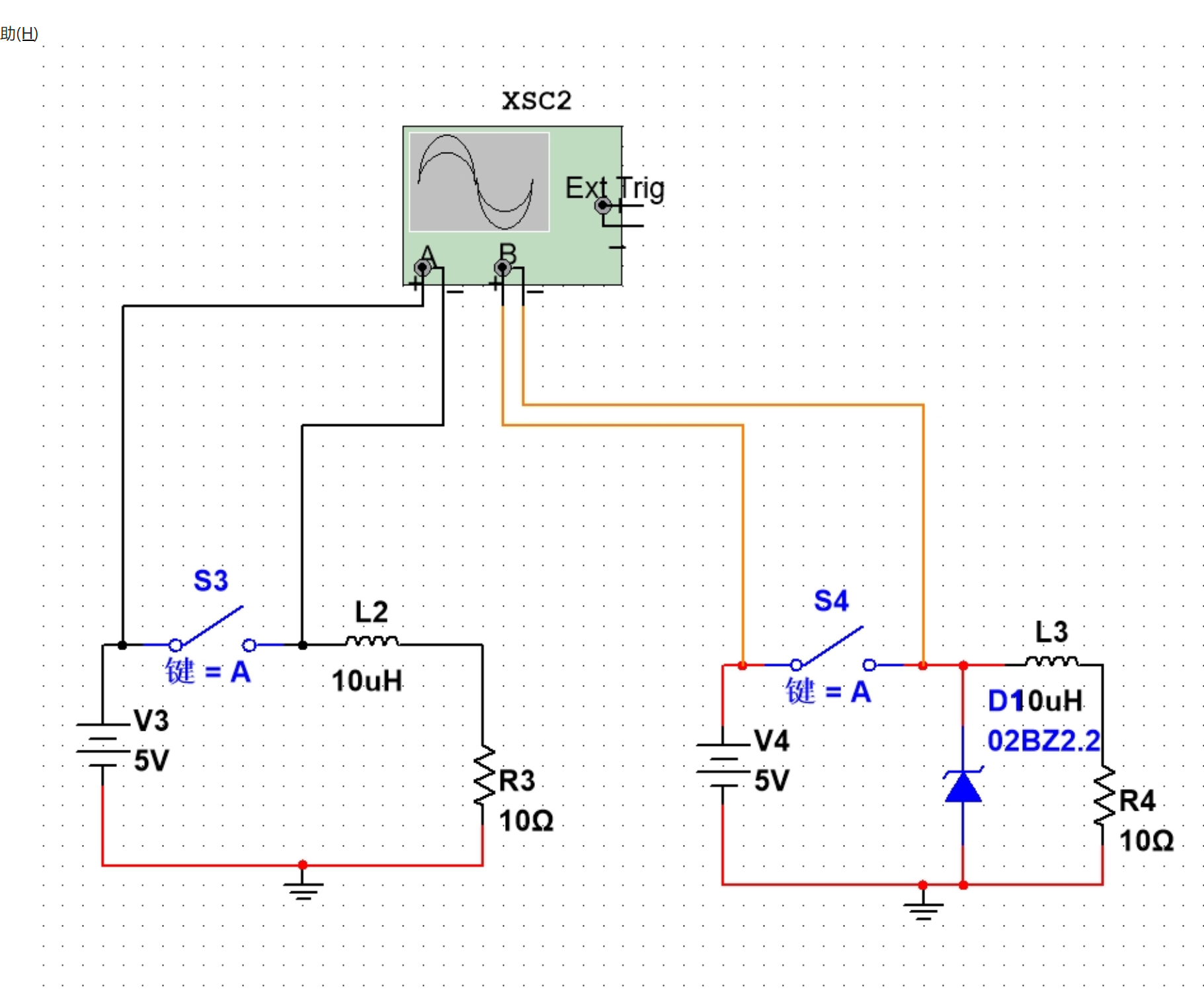(1)当开关闭合时,示波器中B通道波形爬坡式上升,最终达到平衡点,可以推算出电路中电流最大值是0.5A。