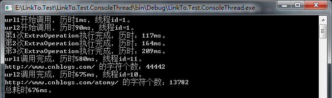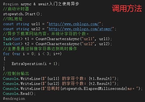 class Program { //创建计时器 private static readonly Stopwatch stopwatch = new Stopwatch(); static void Main(string[] args) { #region async & await入门一之使用异步 //启动计时器 stopwatch.Start(); //URL地址 const string url1 = "http://www.cnblogs.com/"; const string url2 = "http://www.cnblogs.com/atomy/"; //异步下载某网站内容,并统计字符的个数。 Task<int> t1 = CountCharactersAsync("url1", url1); Task<int> t2 = CountCharactersAsync("url2", url2); //主要是通过拼接字符串达到耗时操作 for (var i = 0; i < 3; i++) { ExtraOperation(i + 1); } //控制台输出 Console.WriteLine($"{url1} 的字符个数:{t1.Result}"); Console.WriteLine($"{url2} 的字符个数:{t2.Result}"); Console.WriteLine($"总耗时{stopwatch.ElapsedMilliseconds}ms。"); Console.Read(); #endregion } /// <summary> /// 统计字符个数 /// </summary> /// <param name="id"></param> /// <param name="address"></param> /// <returns></returns> private static async Task<int> CountCharactersAsync(string name, string address) { var wc = new WebClient(); Console.WriteLine($"{name}开始调用,历时{stopwatch.ElapsedMilliseconds}ms,线程id={Thread.CurrentThread.ManagedThreadId}。"); var result =await wc.DownloadStringTaskAsync(address); Console.WriteLine($"{name}调用完成,历时{stopwatch.ElapsedMilliseconds}ms,线程id={Thread.CurrentThread.ManagedThreadId}。"); return result.Length; } /// <summary> /// 额外操作 /// </summary> /// <param name="id"></param> private static void ExtraOperation(int id) { //这里是通过拼接字符串进行一些相对耗时的操作 var s = ""; for (var i = 0; i < 6000; i++) { s += i; } Console.WriteLine($"第{id}次ExtraOperation执行完成,历时:{stopwatch.ElapsedMilliseconds}ms。"); } }