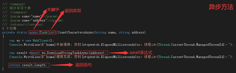 3)await表达式:用于异步方法内部,指出需要异步执行的任务。