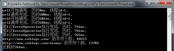 class Program { //创建计时器 private static readonly Stopwatch stopwatch = new Stopwatch(); static void Main(string[] args) { #region async & await入门一之不使用异步 //启动计时器 stopwatch.Start(); //URL地址 const string url1 = "http://www.cnblogs.com/"; const string url2 = "http://www.cnblogs.com/atomy/"; //异步下载某网站内容,并统计字符的个数。 var result1 = CountCharacters("url1", url1); var result2 = CountCharacters("url2", url2); //主要是通过拼接字符串达到耗时操作 for (var i = 0; i < 3; i++) { ExtraOperation(i + 1); } //控制台输出 Console.WriteLine($"{url1} 的字符个数:{result1}"); Console.WriteLine($"{url2} 的字符个数:{result2}"); Console.WriteLine($"总耗时{stopwatch.ElapsedMilliseconds}ms。"); Console.Read(); #endregion } /// <summary> /// 统计字符个数 /// </summary> /// <param name="id"></param> /// <param name="address"></param> /// <returns></returns> private static int CountCharacters(string name, string address) { var wc = new WebClient(); Console.WriteLine($"{name}开始调用,历时{stopwatch.ElapsedMilliseconds}ms,线程id={Thread.CurrentThread.ManagedThreadId}。"); var result = wc.DownloadString(address); Console.WriteLine($"{name}调用完成,历时{stopwatch.ElapsedMilliseconds}ms,线程id={Thread.CurrentThread.ManagedThreadId}。"); return result.Length; } /// <summary> /// 额外操作 /// </summary> /// <param name="id"></param> private static void ExtraOperation(int id) { //这里是通过拼接字符串进行一些相对耗时的操作 var s = ""; for (var i = 0; i < 6000; i++) { s += i; } Console.WriteLine($"第{id}次ExtraOperation执行完成,历时:{stopwatch.ElapsedMilliseconds}ms。"); } }