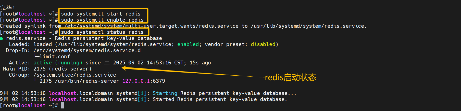 sudo systemctl start redis # 启动Redis sudo systemctl enable redis # 开机自启 sudo systemctl status redis # 检查状态