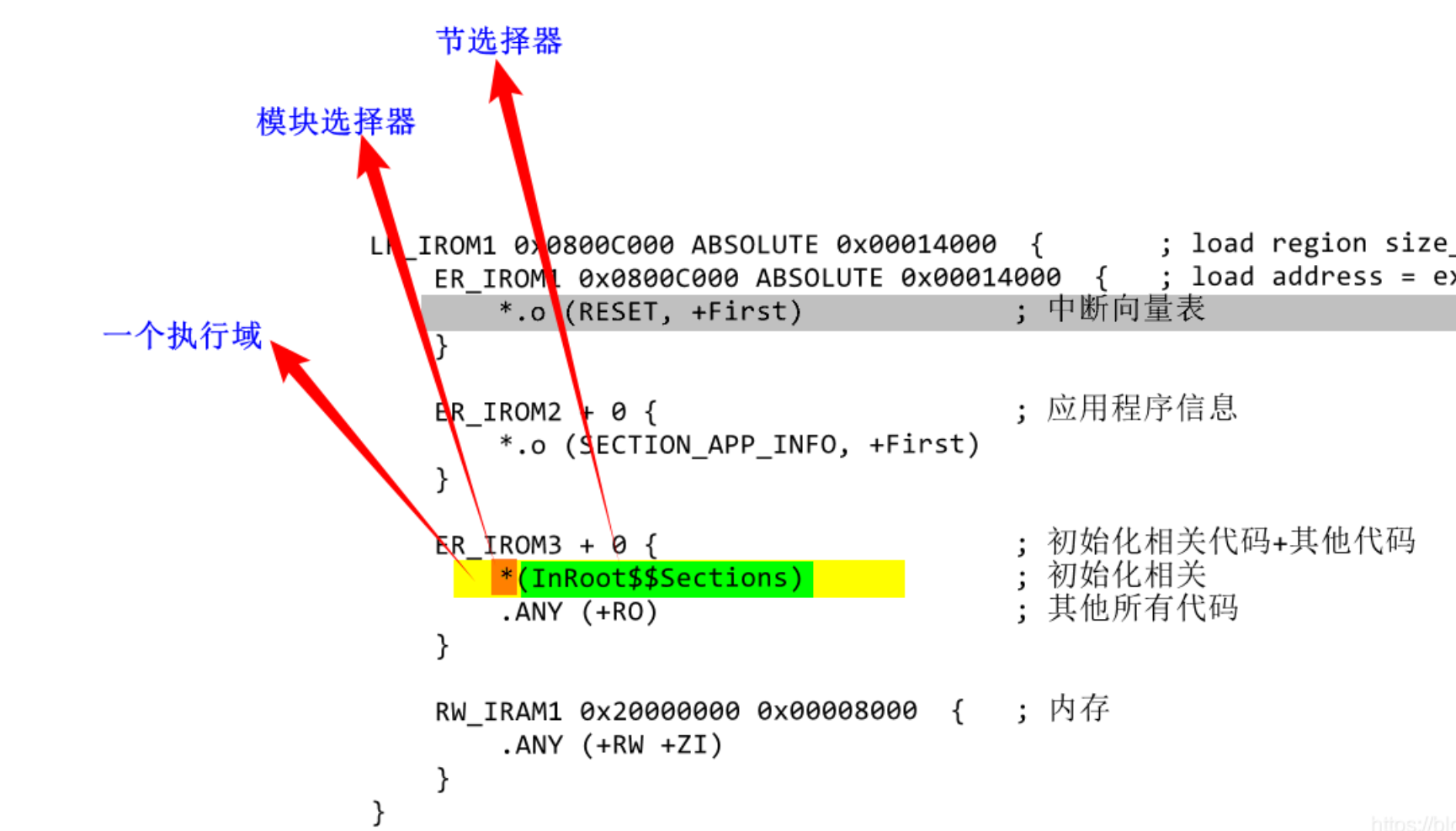 keil编译器在链接的时候,是根据分散加载(.scf后缀的文件)来确定程序的加载域和运行域的。
