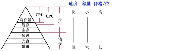 速度(快-慢):CPU(寄存器、缓存)、主存、磁盘
