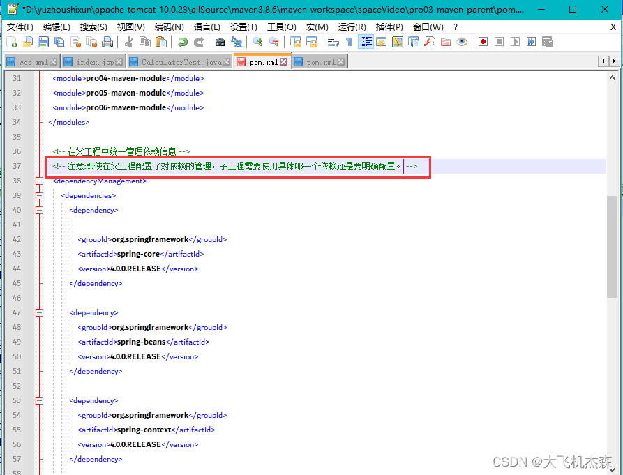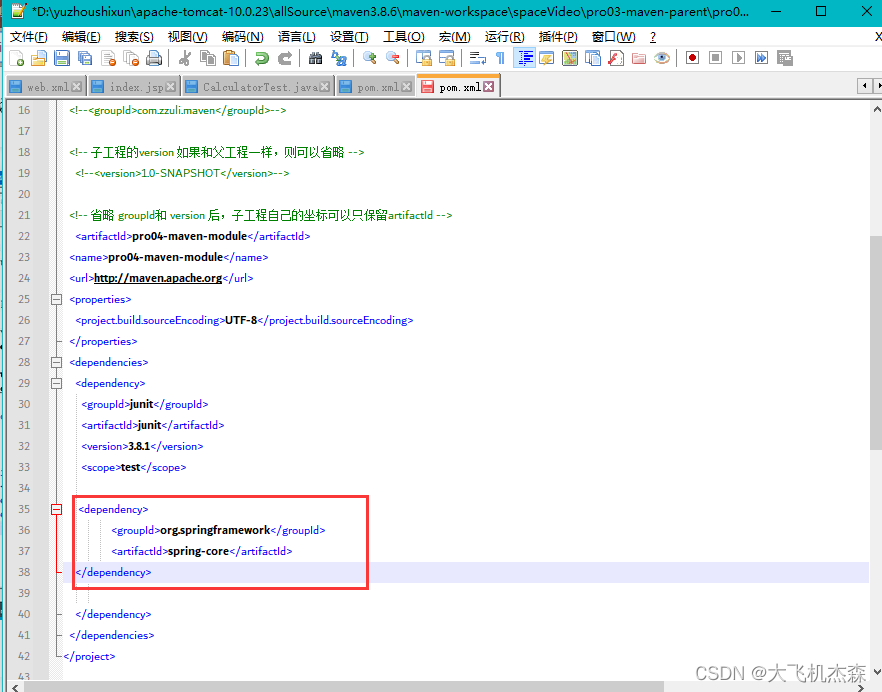 哪个子工程需要哪个依赖,就在该子工程的pom.xml文件中去配置依赖的坐标即可,可不配置version ,例如子工程pro04-maven-modul需要spring-core,就在其pom.xml文件中配置相应坐标即可