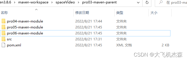 假设,我们创建三个模块工程:(从继承的角度来说是父工程和子工程的关系,从聚合的角度来说是总工程和模块工程的关系)