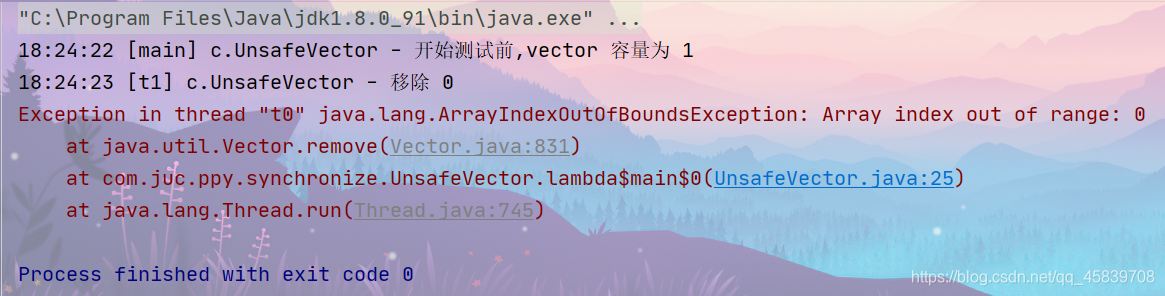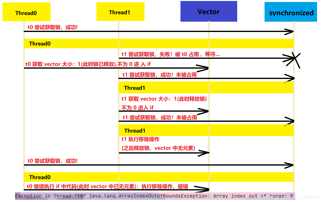 ② 线程 t0 本应输出 "容量为 0 无法执行移除操作" 但是抛出数组越界异常