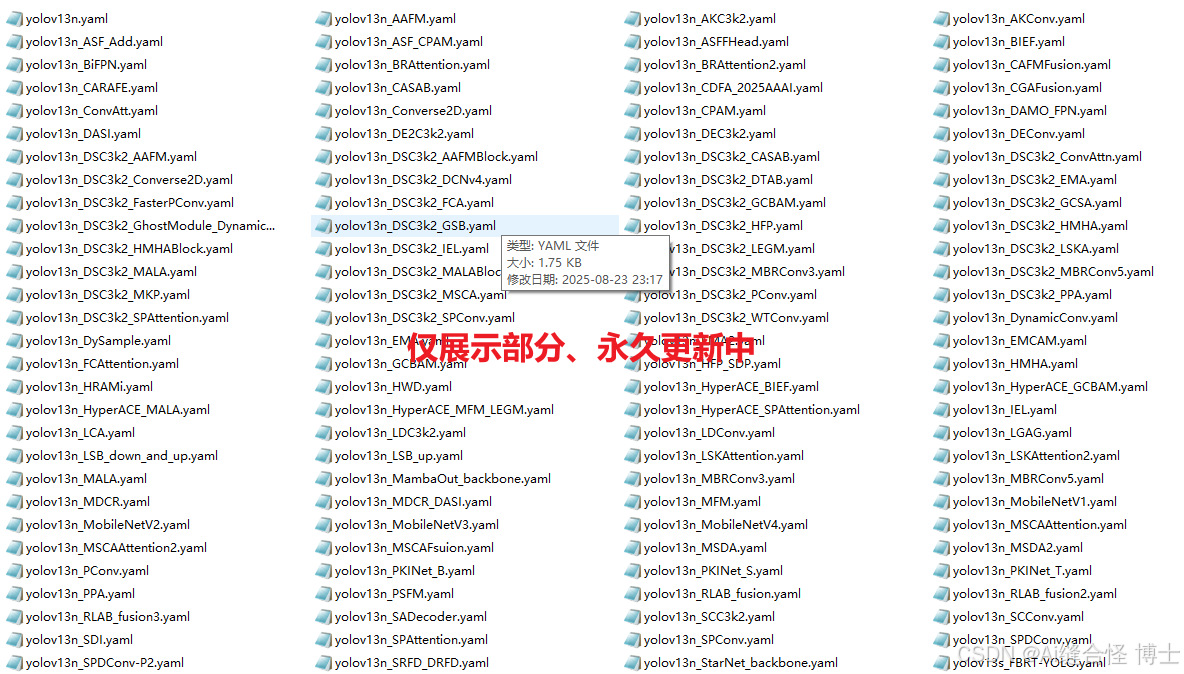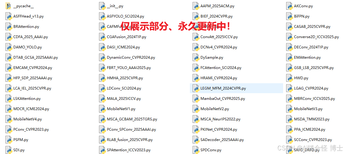 大家购买专栏后,进对应学习交流群便可获得完整的程序文件,下方仅为展示的部分改进模块和yaml文件截图。订阅后,配置好YOLO虚拟环境即可跑自己的实验。因为创新改进点会持续更新500+,完全够小伙伴从研一到研三,从小论文到大论文使用。每个yaml文件中的改进点,可更换不同的层,及使用数量,也可以和其它yaml文件改进点自行组合,实现高效涨点。永久更新中
