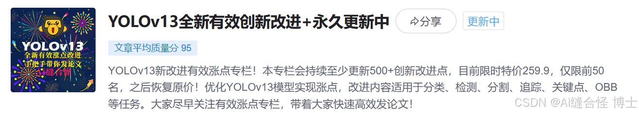 全新YOLOv13专栏限时订阅链接:全新YOLOv13创新改进高效涨点+永久更新中(至少500+改进)+高效跑实验发论文