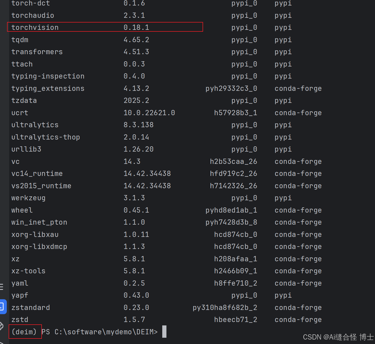 比如下面截图是我的deim虚拟环境pytorch和torchvision版本举例: