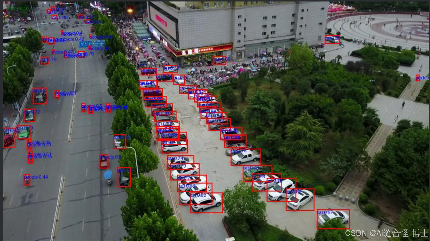 VisDrone数据集是由天津大学等团队开源的一个大型无人机视角的数据集,官方提供的数据中训练集是6471、验证集是548、测试集1610张。数据集共提供了以下12个类,分别是:‘忽略区域’, ‘pedestrian’, ‘people’, ‘bicycle’, ‘car’, ‘van’,‘truck’, ‘tricycle’, ‘awning-tricycle’, ‘bus’, ‘motor’, ‘others’,其中忽略区域、others是非有效目标区域,本项目中予以忽略,只使用’pedestrian’, ‘people’, ‘bicycle’, ‘car’, ‘van’,‘truck’, ‘tricycle’, ‘awning-tricycle’, ‘bus’, 'motor’10个类。