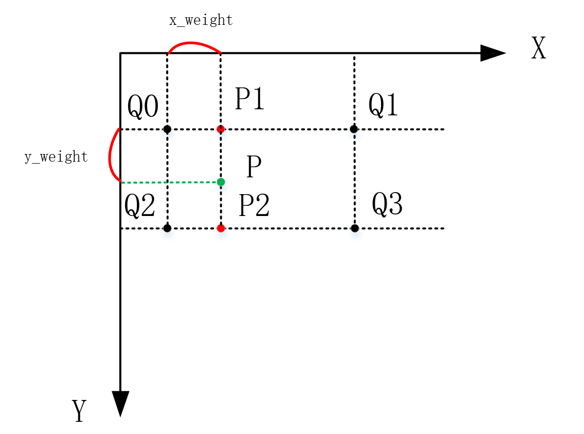 通过Q0,Q1,Q2,Q3,经过两次线性插值算法,求得P1_y,P2_y,再由P1_y,P2_y求得P_y,这个P_y就是在目标图像上的像素值