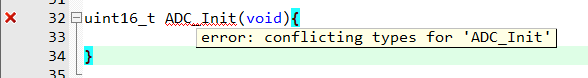 ADC_Init之前,未提前声明函数原型,编译器会进行隐式声明(默认返回int类型)。若后续定义的函数返回值不是int,则会触发类型冲突。 -