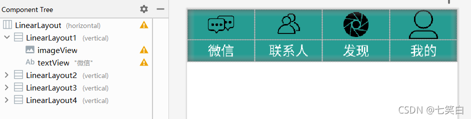 2.bottom区域:(bottom.xml)在一个垂直的LinearLayout中使用四个水平的LinearLayout,四个水平的LinearLayout中都由一个ImageView和TextView组成,分别显示四个页面的图标以及名称。