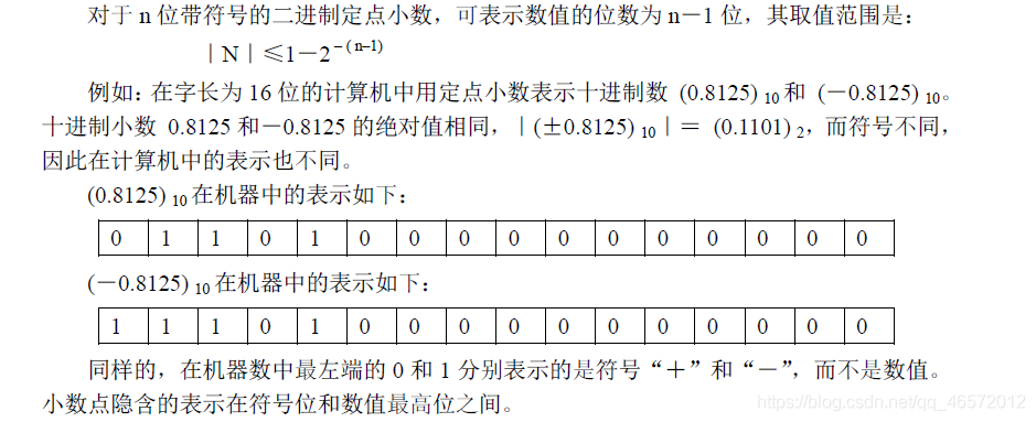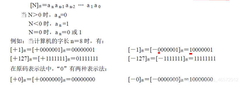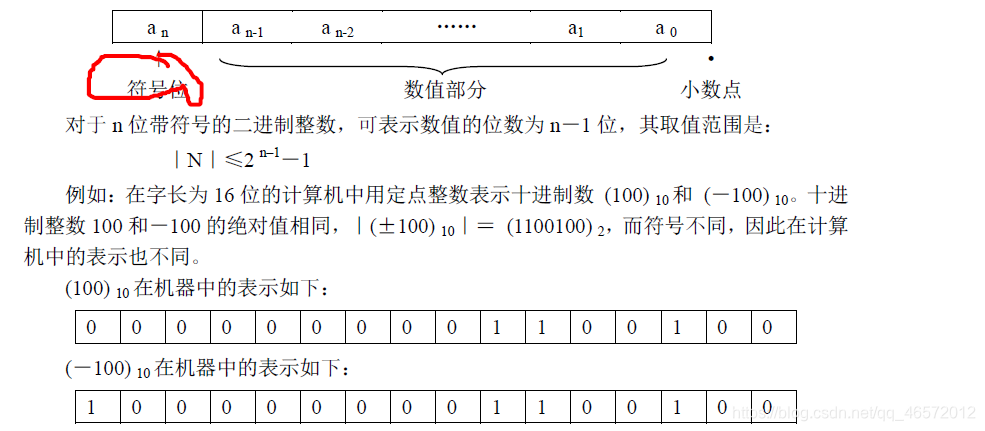 “0”表示正号,“1”表示负号,其余位表示二进制数的数值。