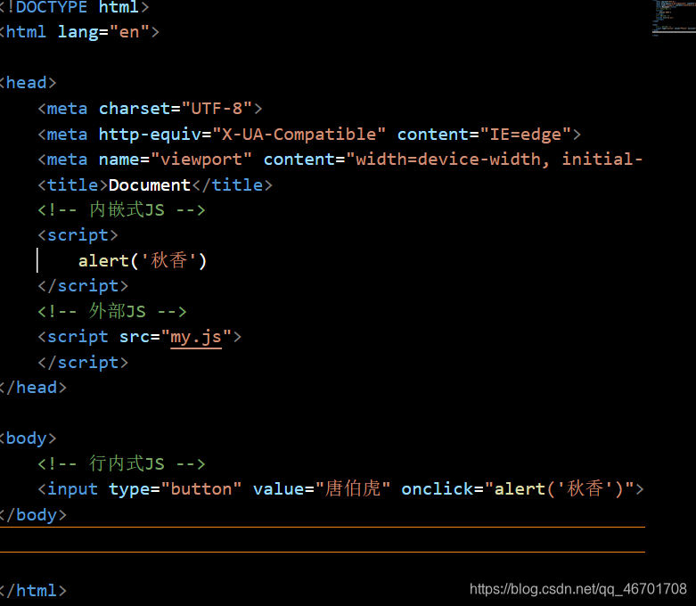 可以将单行或少量JS代码写在HTML标签的事件属性中(以on开头的属性),如onclick;