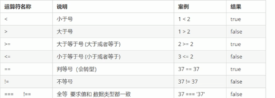 概念:比较运算符(关系运算符)是两个数据进行比较时所使用的运算符,比较运算后,会返回一个布尔值(true/false)作为比较运算结果。