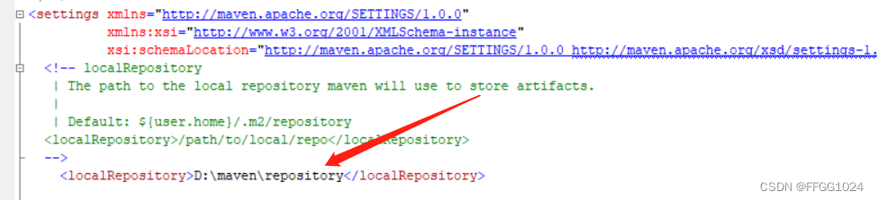 打开 settings.xml 文件,并找到 <localRepository> 元素。该元素用于设置本地仓库的路径。如果该元素不存在,则需要手动添加如下配置: