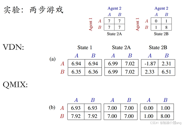 B站的这个视频的例子可以更好的帮助理解。Agent1选择用左边的表还是右边的表各,选定后,Agent1和Agent2同时执行动作A或者B,以得到集体最大收益。