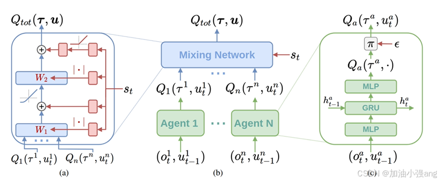 QMIX是一个典型的CTDE算法,维护了一个中心Mixing网络,这个Mixing网络的作用可以理解为合理的分配各个智能体的加权。输入是各个agent的Q值,输出是经过Mixing网络多层组合的全局Q值。注意:训练mixing网络时,输入是智能体的状态St,训练的目标是取得更恰当的Qmixing网络权重。
