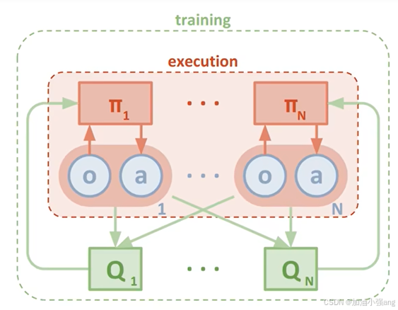 在执行阶段,智能体仅利用自身观测和状态和局部信息选择策略。