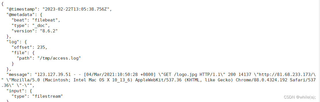 filebeat采用前台运行的方式查看Filebeat获取的日志结果