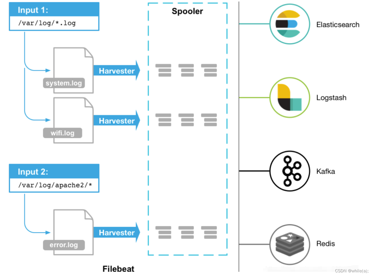 Filebeat 是用于搜集日志,之后把日志推送到某个接收的系统中的,这些系统或者装置在 Filebeat 中称为