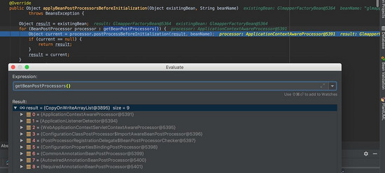 如何找到 bean 被提前初始化的时机呢?可以在 org.springframework.beans.factory.support.AbstractAutowireCapableBeanFactory#createBean(java.lang.String, org.springframework.beans.factory.support.RootBeanDefinition, java.lang.Object[]) 打一个条件断点,通过 beanName 进行匹配,然后顺着 debug 堆栈往回找,就能够看到是在哪里导致了 bean 被提前创建。