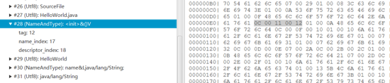 然后又往后读取两个字节 0x001C ,它表示常量池中字段或方法的名称和描述符的索引值。