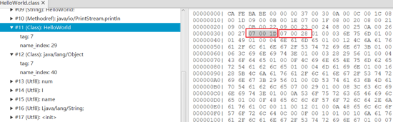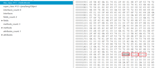 它们都是 CONSTANT_Utf8 类型,按照对应的结构读取之后分别是 HelloWorld , java/lang/Object 。则可知该类名字为 HelloWorld ,它的父类是 java.lang.Object ,它并没有实现接口。