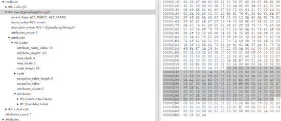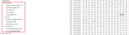 对于 main 方法,可以看到它的访问标识为 00 09 (ACC_STATIC | ACC__PUBLIC),name_index对应常量池的 00 15 ,描述符对应常量池的 00 16 ,属性个数为 00 01 ,然后查看它的属性表: