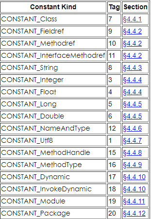 tag表示指示条目所表示的常量类型。共有17种常数:
