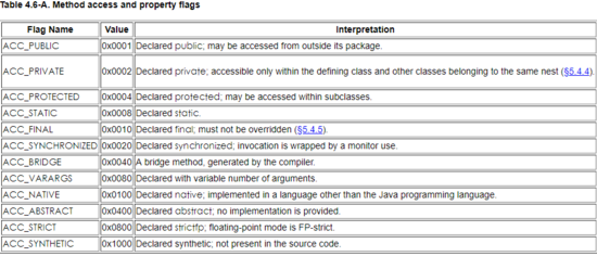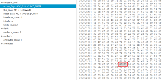 那么可以知道类的访问修饰符为 ACC_PUBLIC|ACC_SUPER ( 0x0021 = 0x0020 + x0001 )。