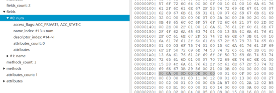 在类信息后面就是字段信息,分别由字段数量( fields_count )和字段表( fields_info )组成,字段数量是一个 u2 类型,主要看下字段信息表的结构:
