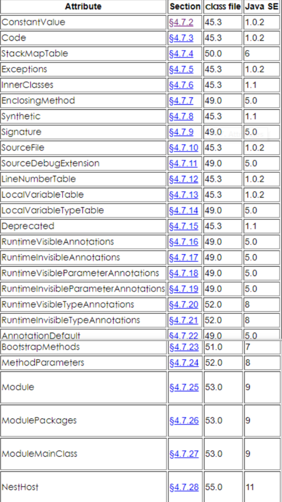 Class文件也自带一些属性,由属性长度和属性内容组成,主要的属性有: