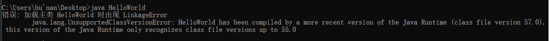 当我人为的将大版本号修改为 0x0039 ,即对应jdk14版本,然后加载类文件,由于我的jdk版本是11,虚拟机只能向下兼容,所以会报错: