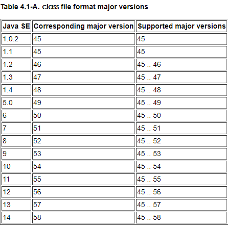 在魔数的后面,就是Class的版本号,它一共有两种:小版本号( minor_version )和大版本号( major_version )。它们组合起来表示当前Class文件是由哪个版本的JDK编译产生的。以下是截取自java官网的版本图: