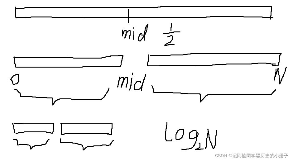 因为每次都是对剩下部分的 二分之一进行一个比较的处理,所以得到时间复杂度为O(logN)