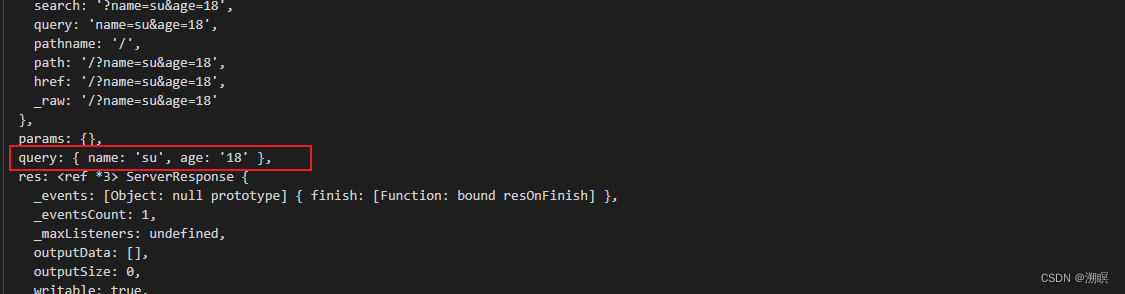 查看打印结果,可以看见,req里面的东西很多,而页面传来的数据装在query这个属性里面,也就是req.query就可以得到前端传来的数据 再 .键值 就可以获得具体的值。