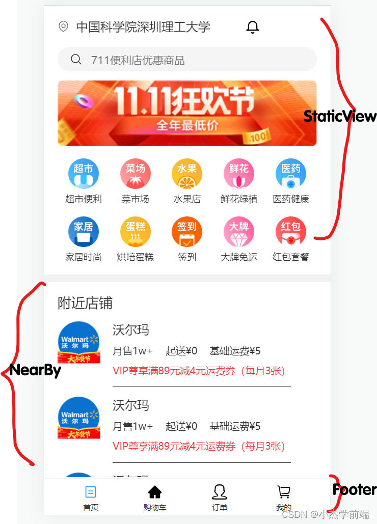 这里HomeView相当于首页的根组件,也就是相当于一个容器里面放着 FooTer,NearBy,StaticView三个子组件,从下图可以看出这三个子组件负责的区域。他们共同构建出了首页的样式。