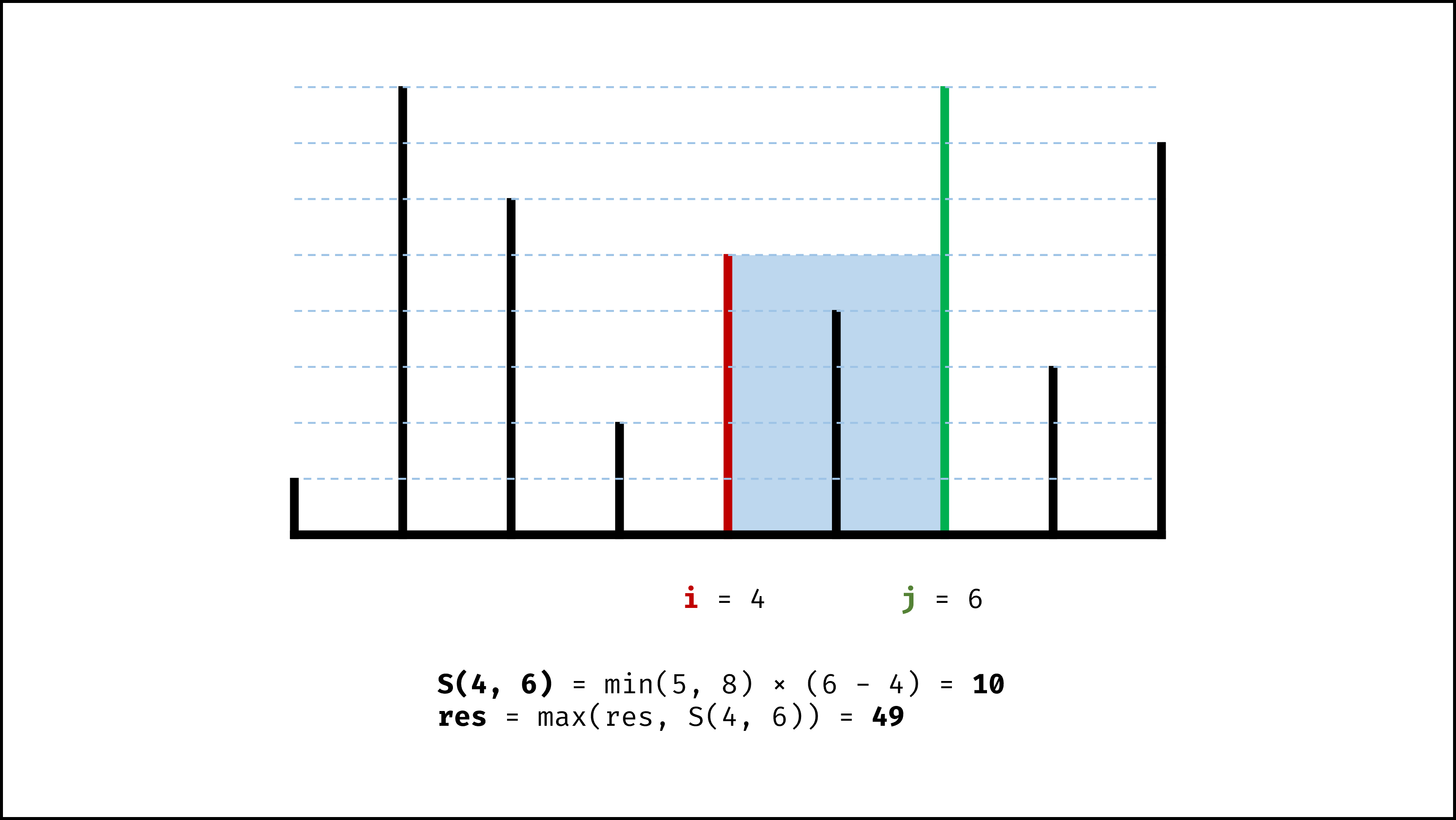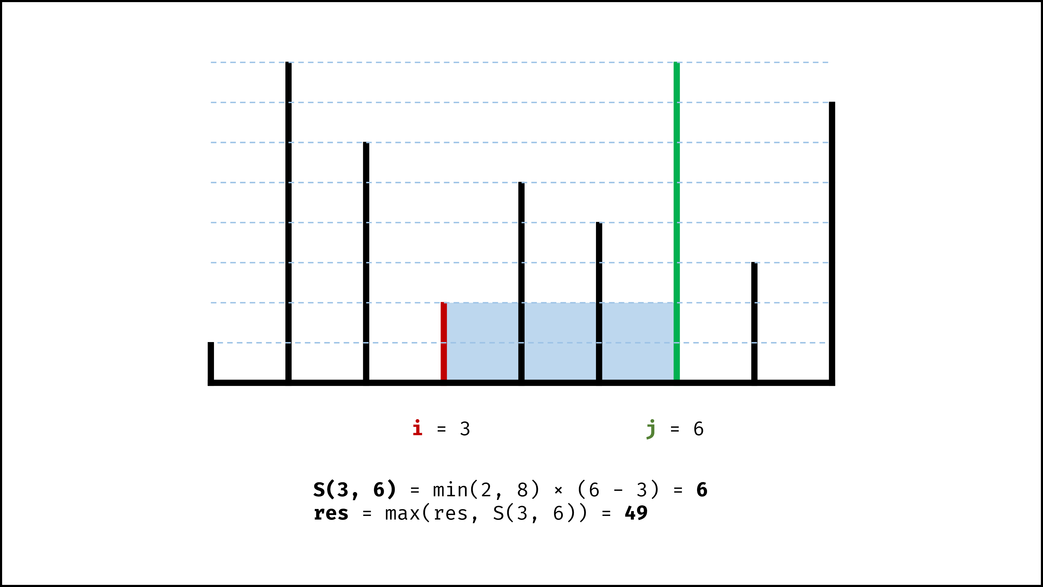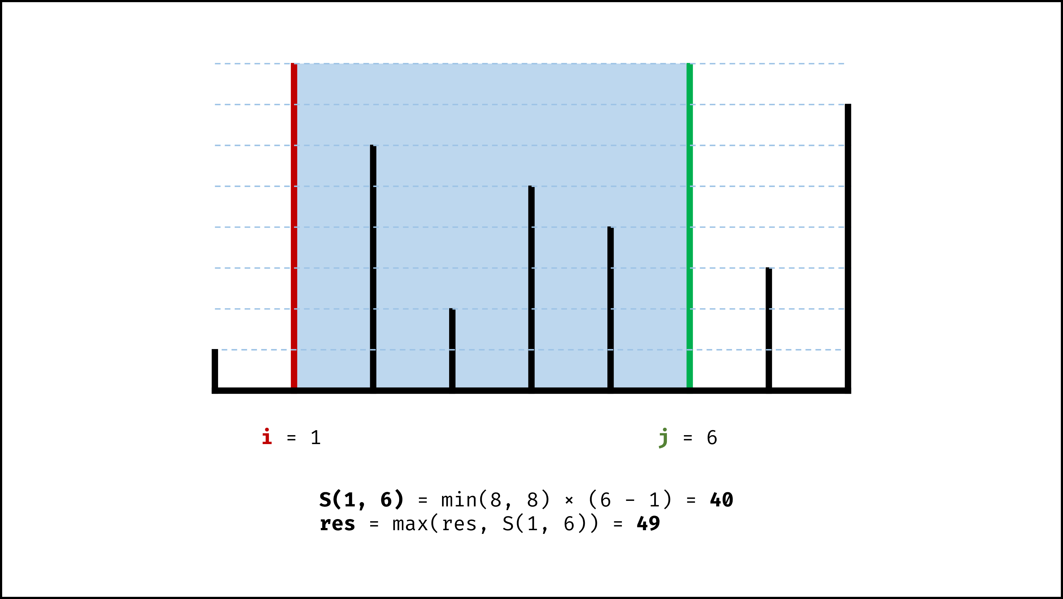 即:S(i,j) = min(h[i],h[j]) × (j−i) (i,j分别为两条垂线的x轴坐标)